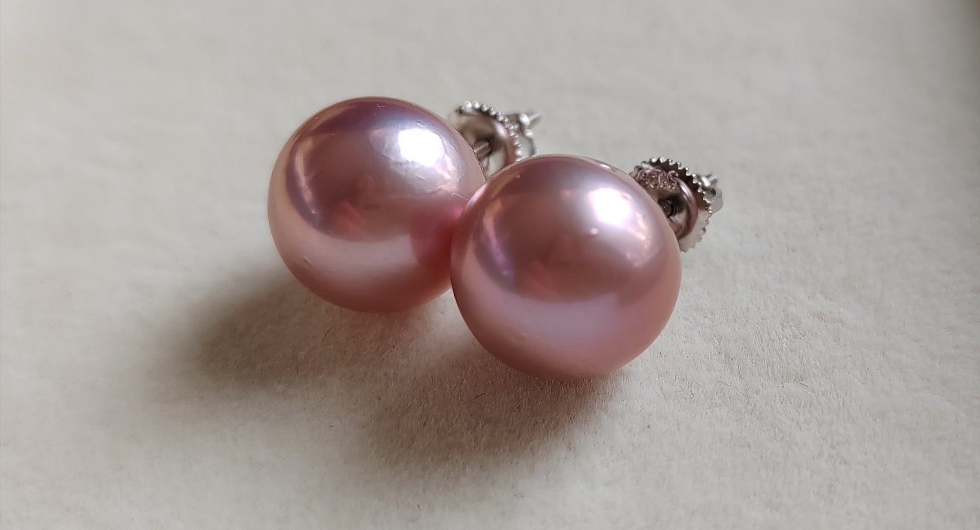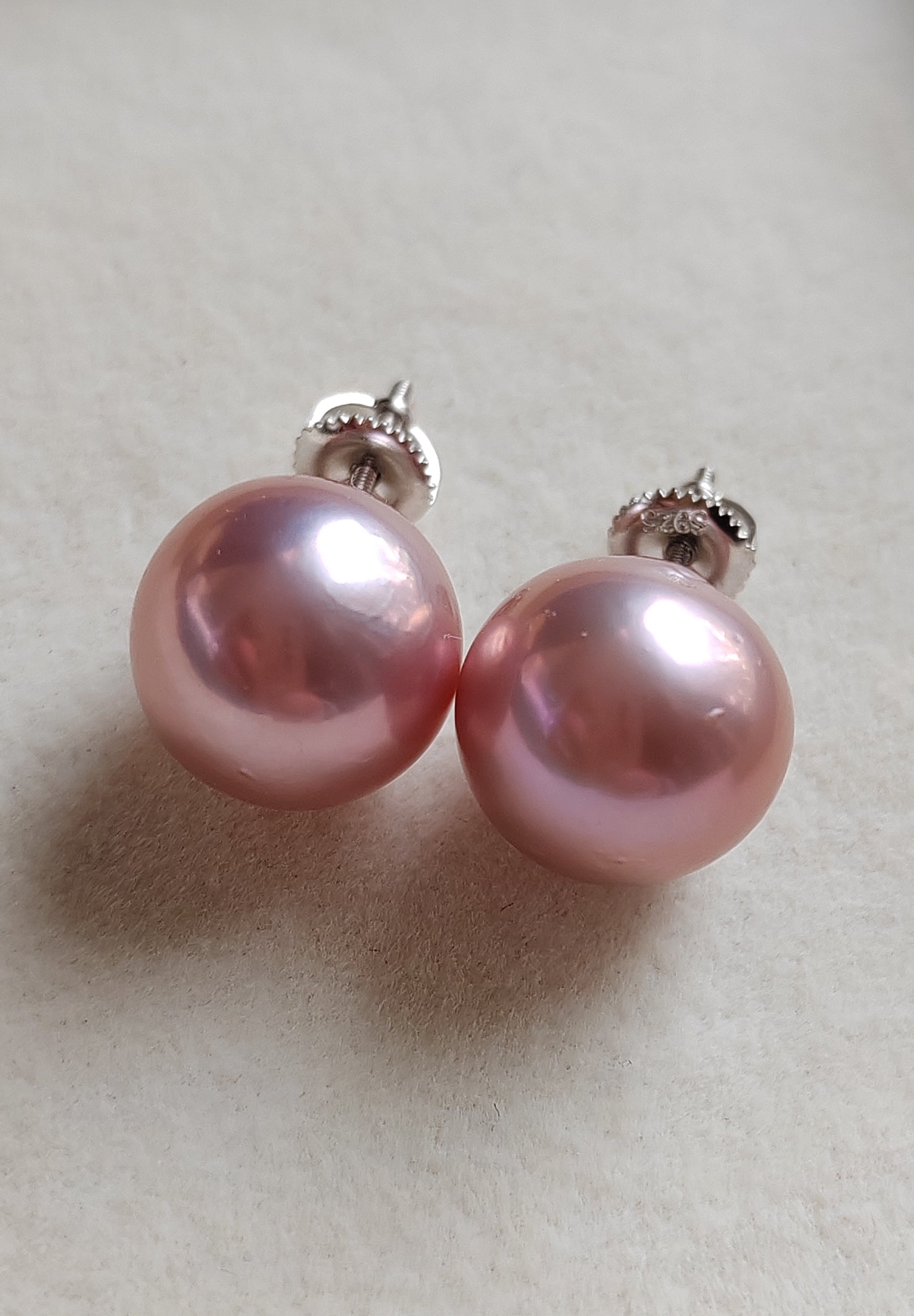 These gorgeous earrings feature two genuine freshwater pearls near round shape excellent luster, mounted on sterling silver base hallmarked with screw backings secure them on your ear.