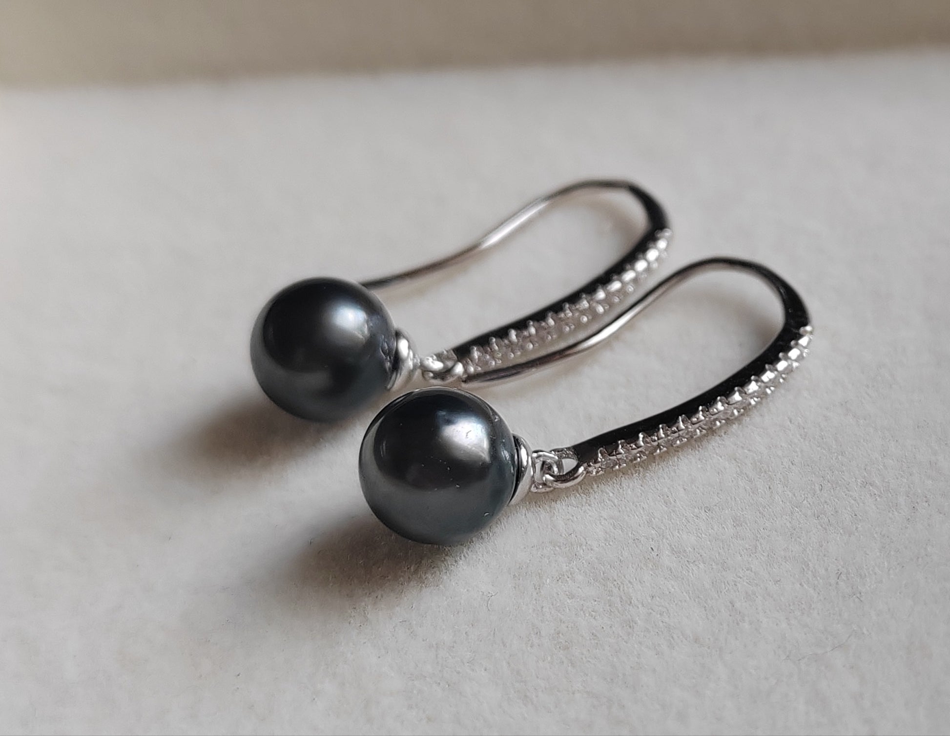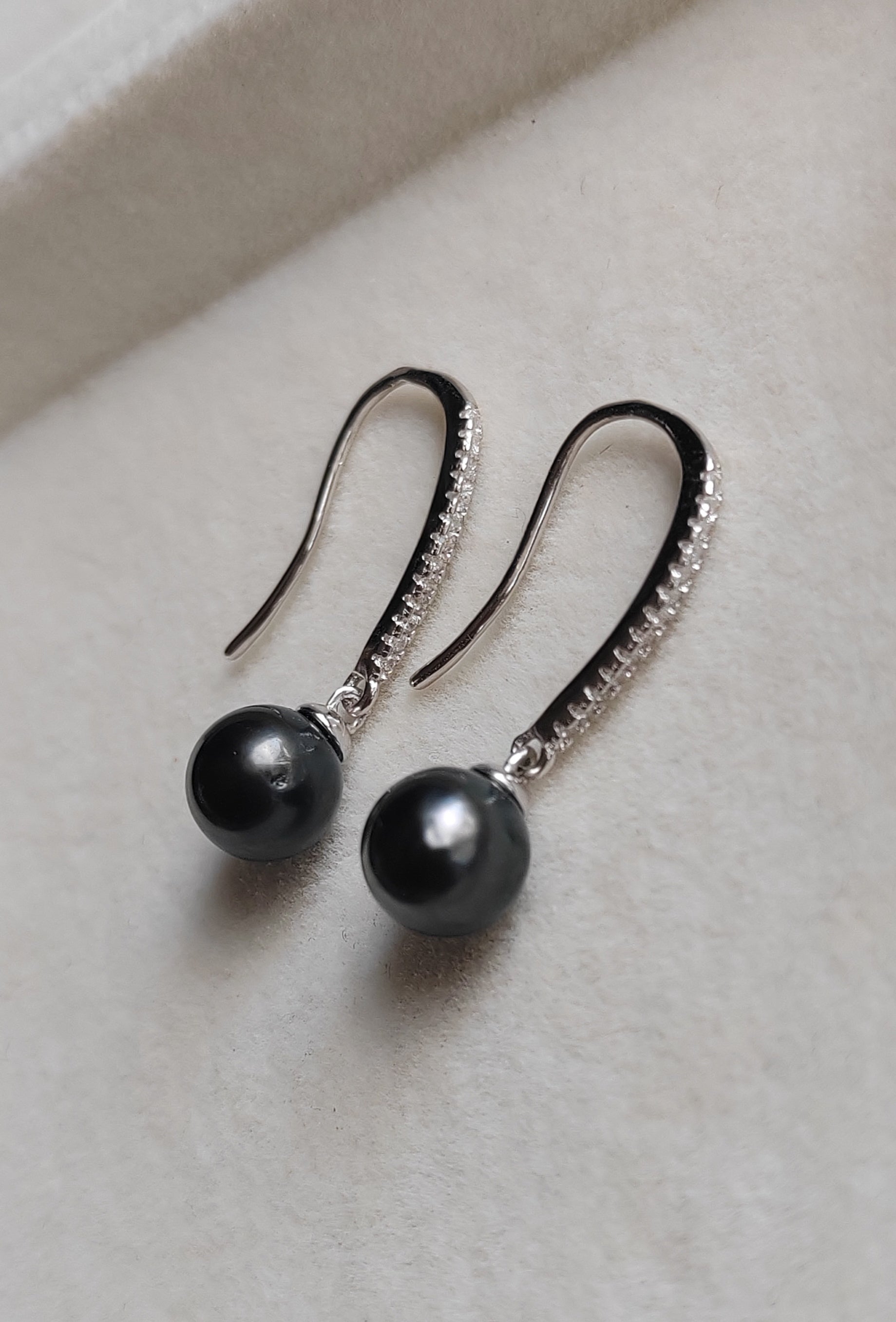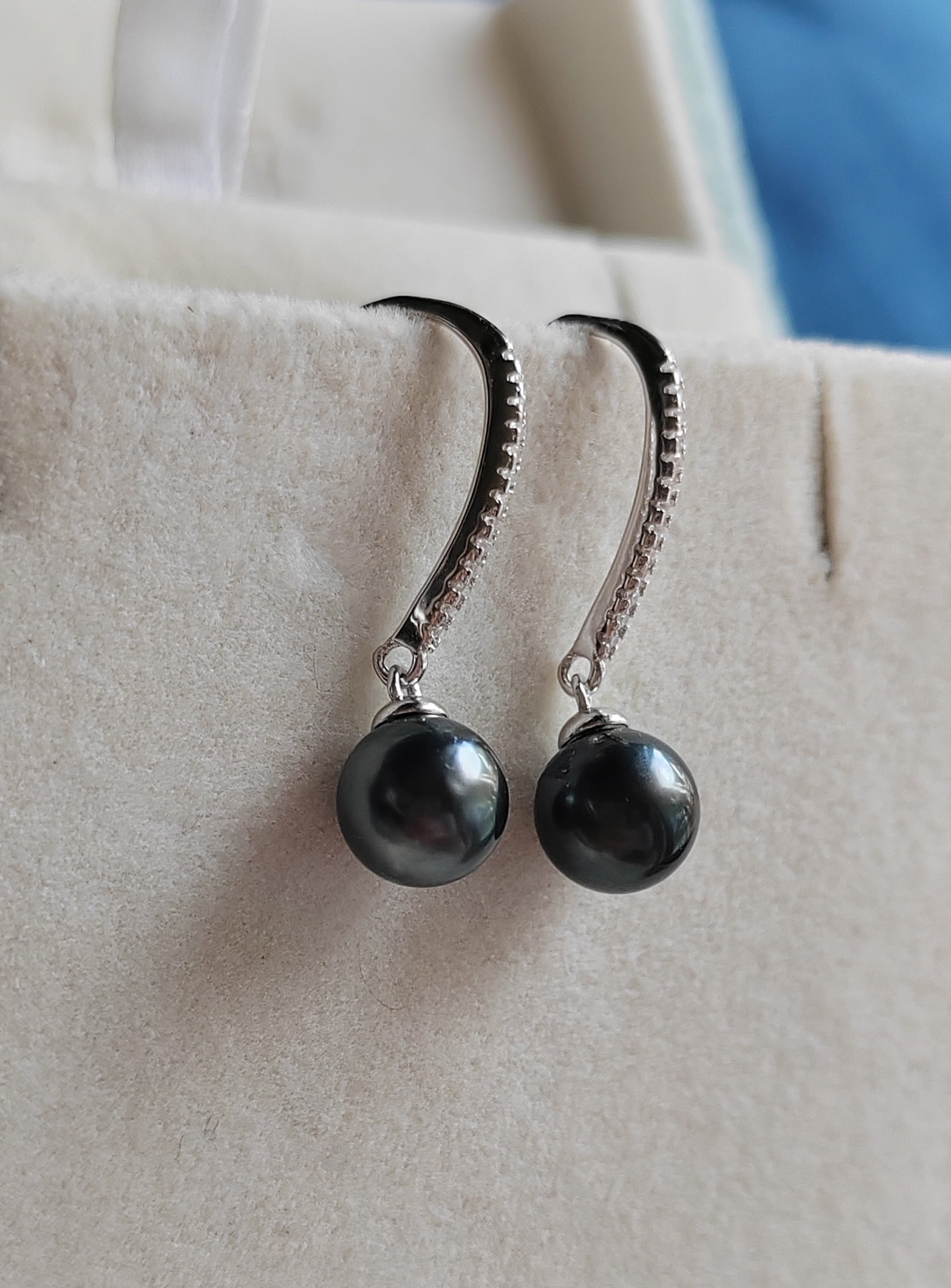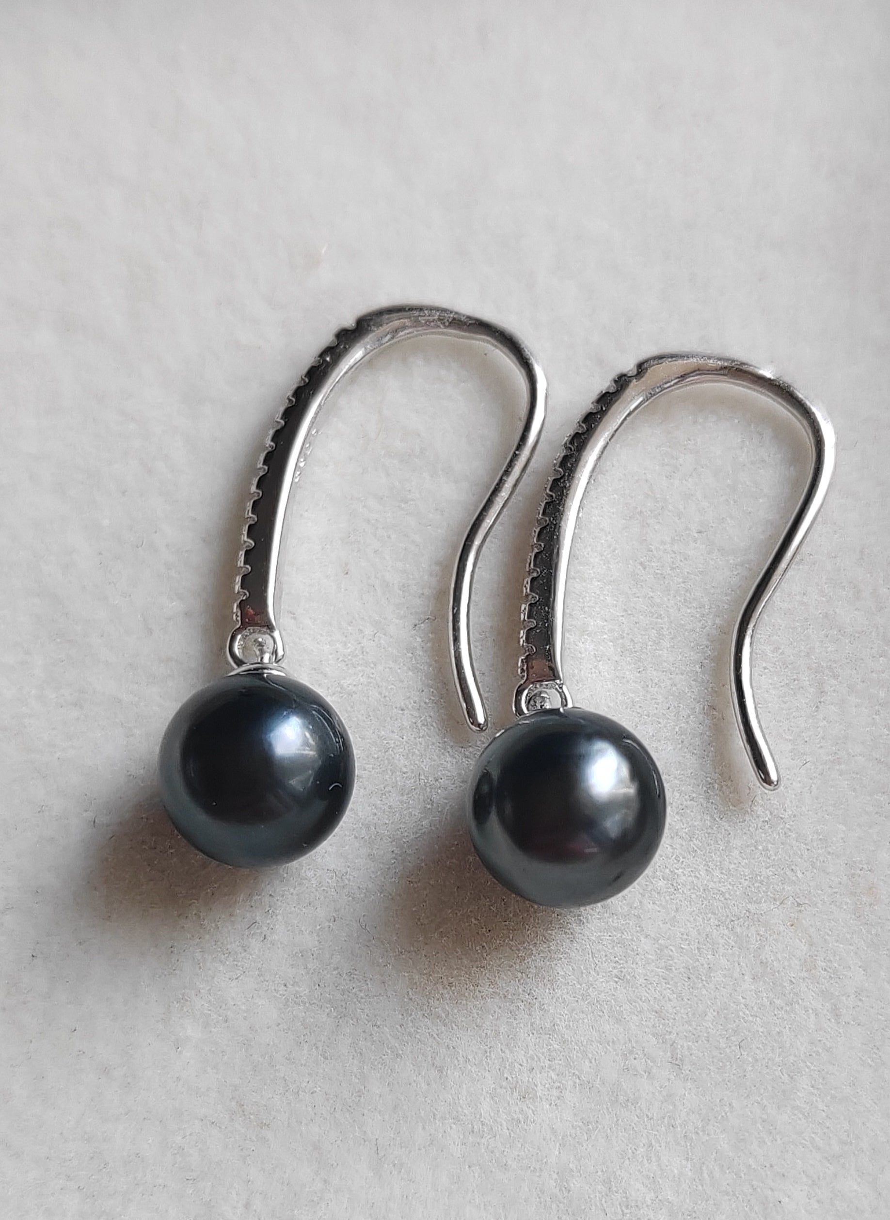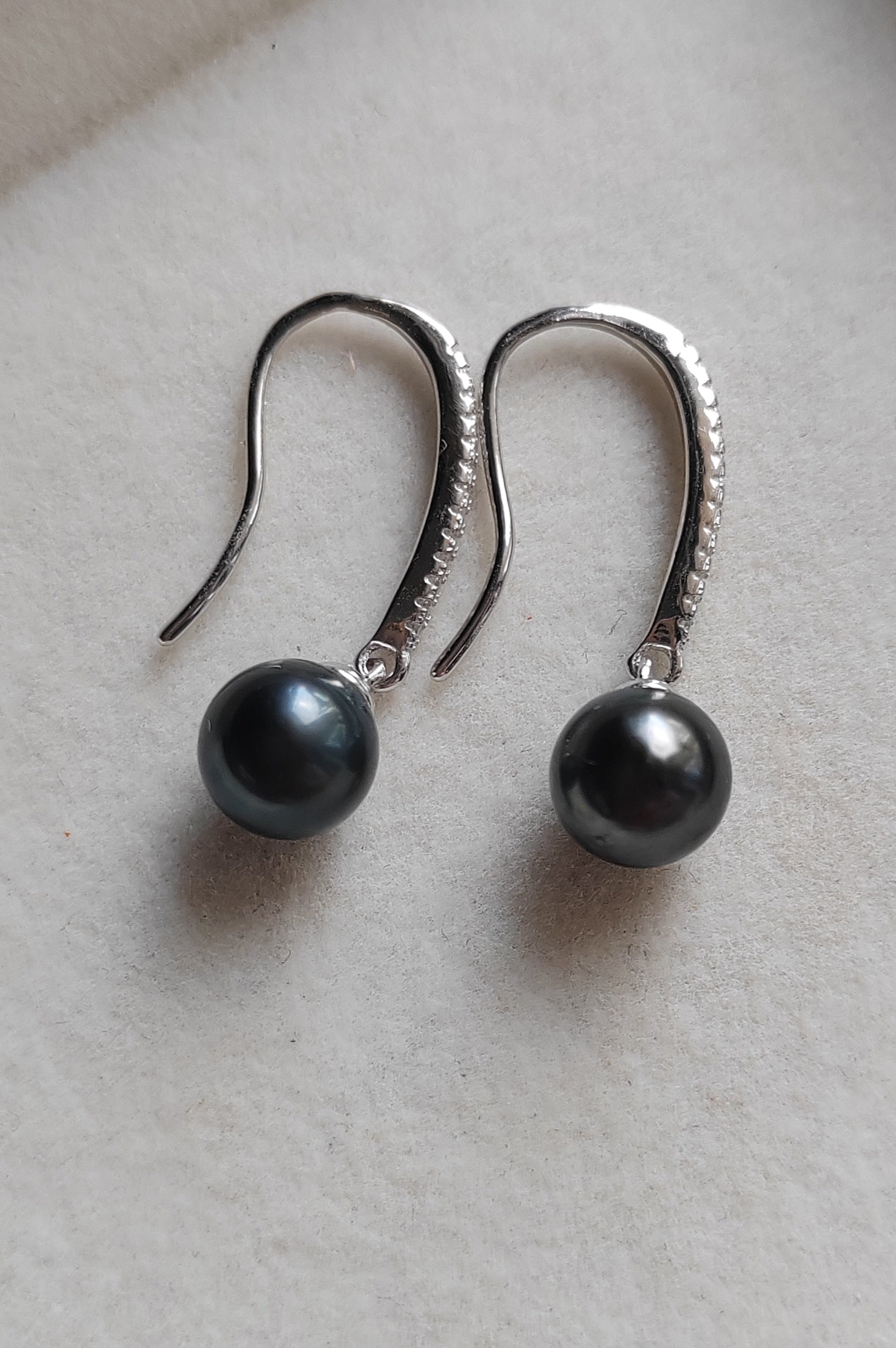 These classic earrings made of two genuine tahitian south sea pearls round shape excellent luster mounted on sterling silver base hallmarked with dazzling cz stones.