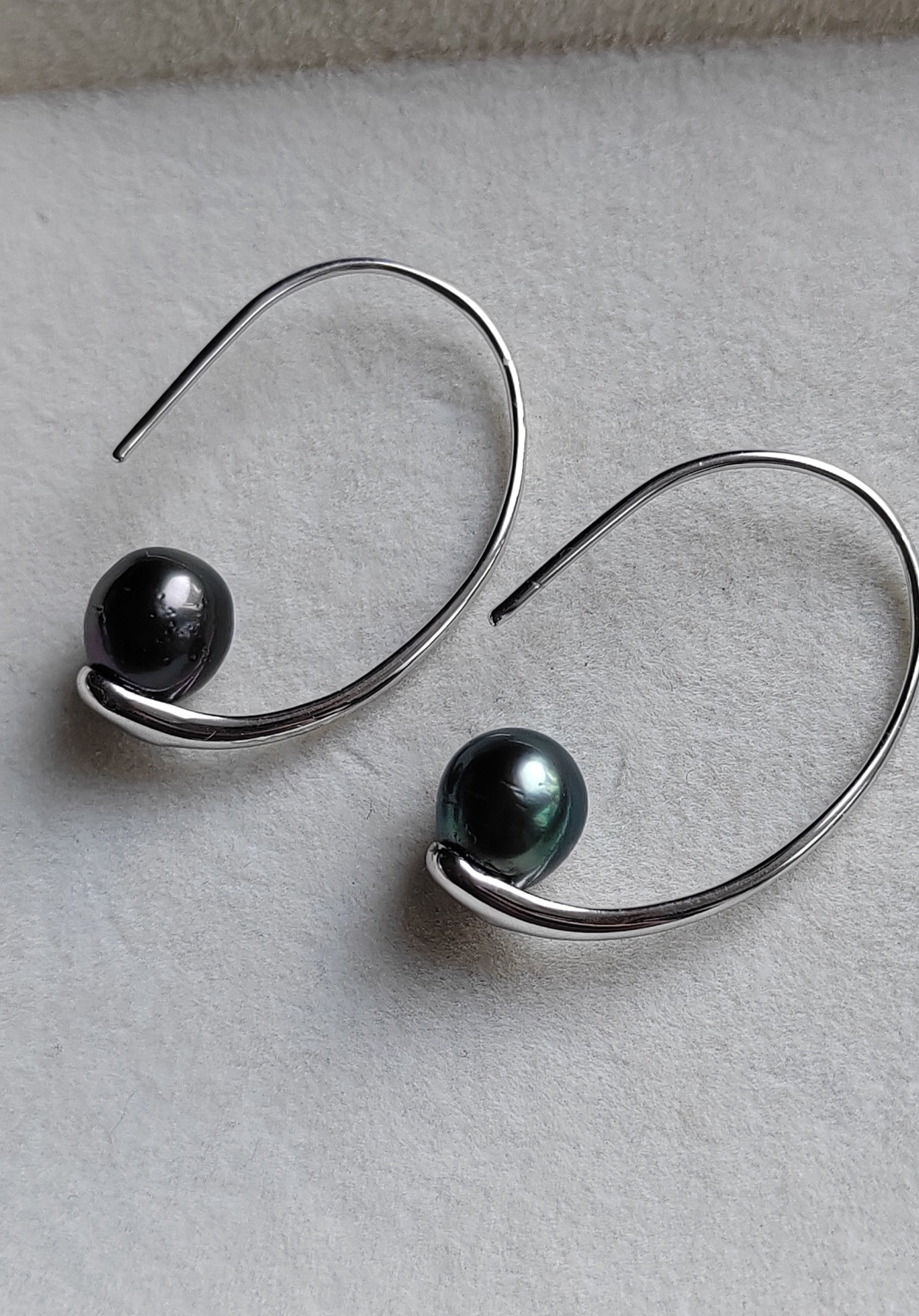 These gorgeous earrings feature two genuine tahitian south sea pearls oval shape excellent luster, in beautiful green and dark purple color, mounted on sterling silver base hallmarked.