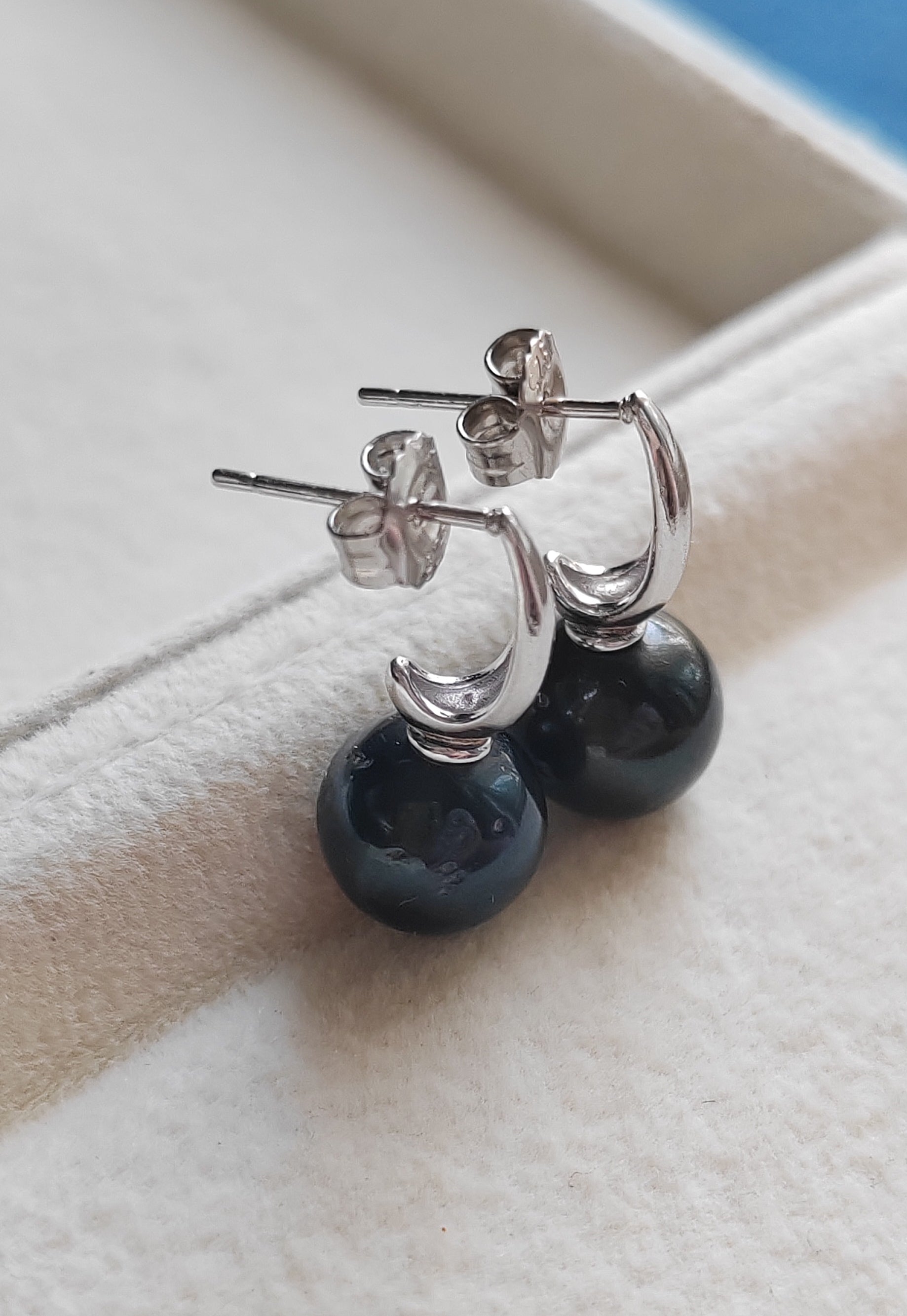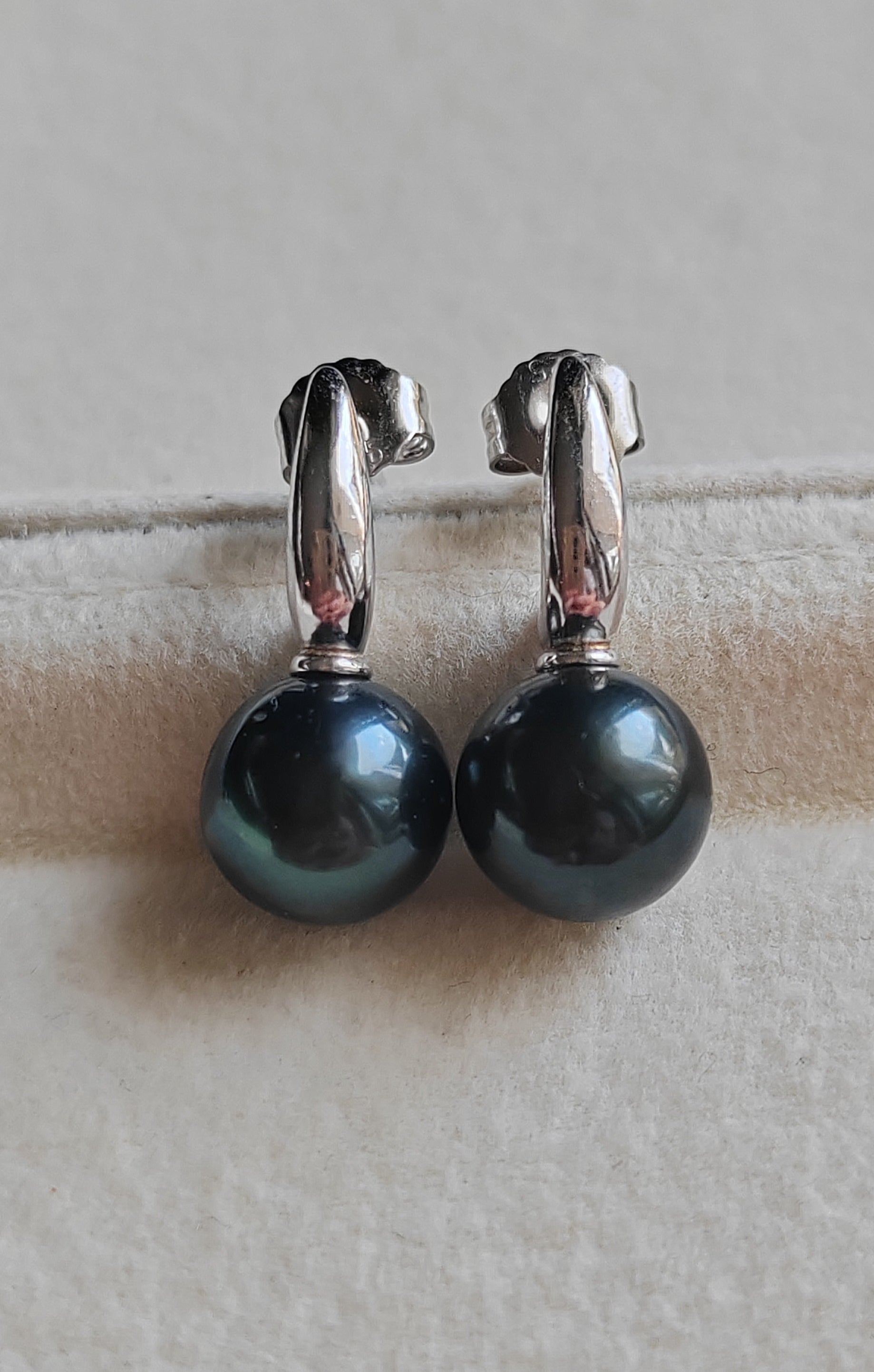 These classic earrings feature two genuine tahitian south sea pearls round shape excellent luster, mounted on sterling silver base hallmarked.