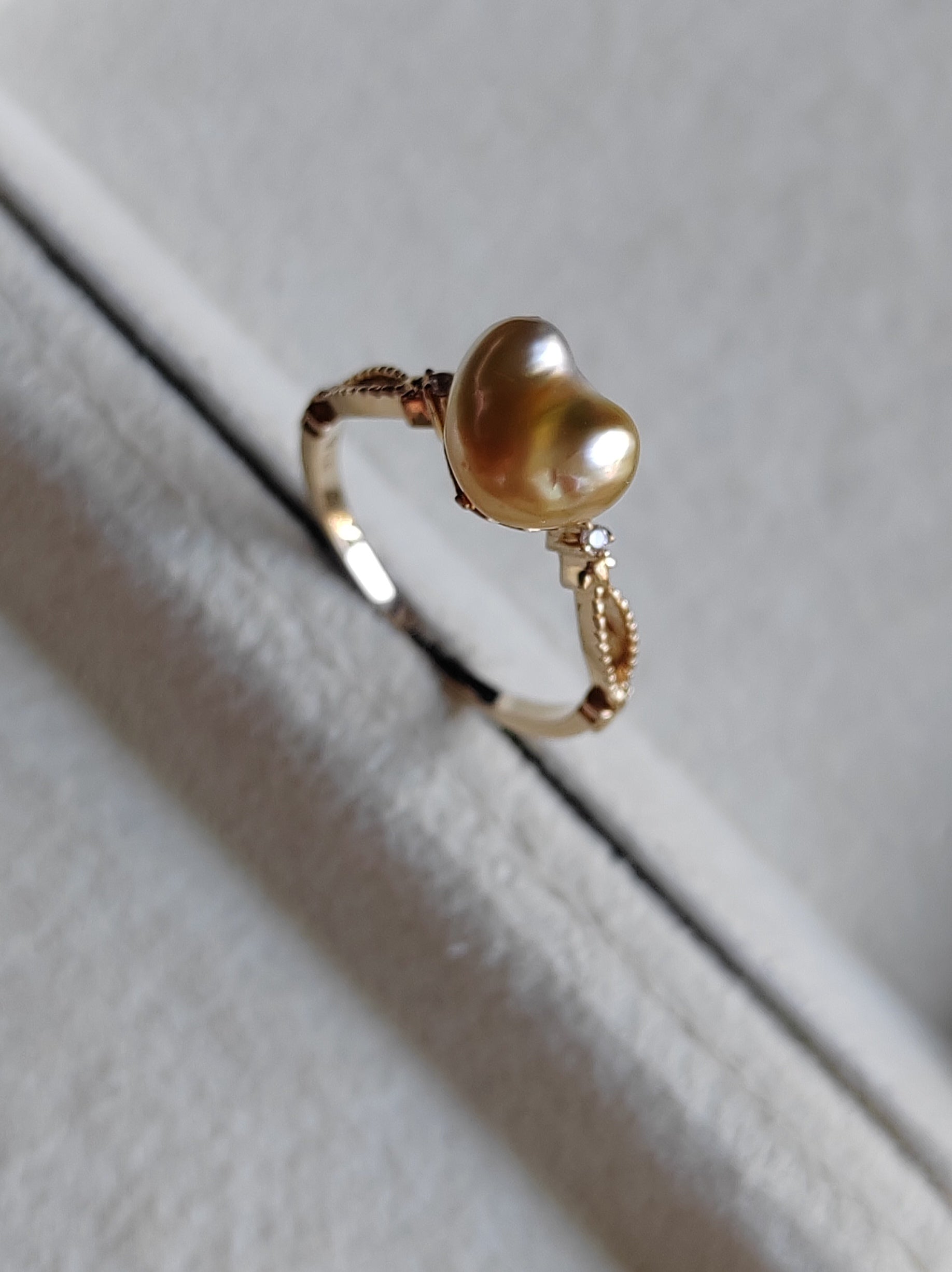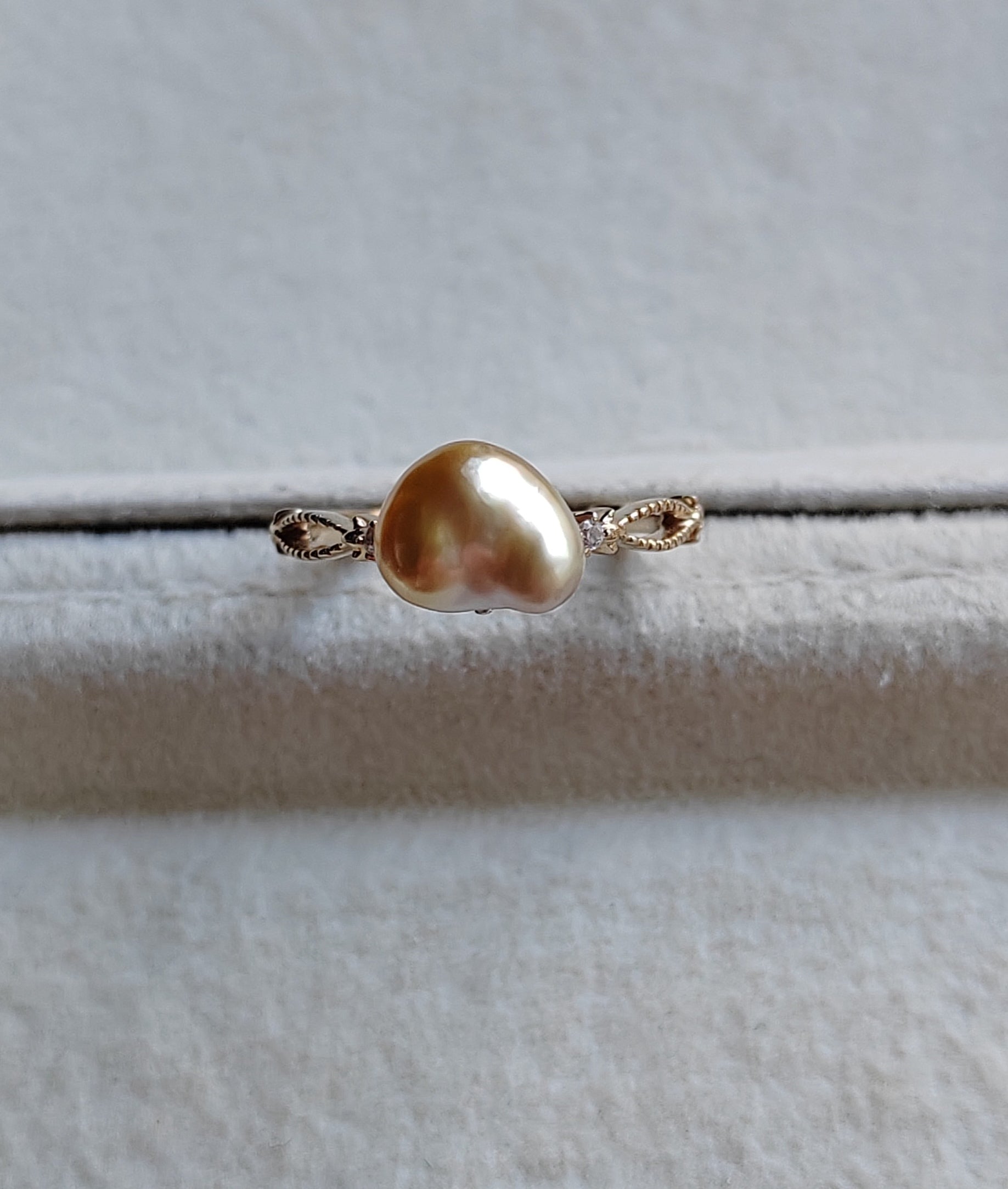 This natural beauty Golden South Sea Keshi Ring features an unique, irregularly shaped pearl excellent luster, clean surface, made entirely of nacre from South Sea oysters, known for their rich golden color, exceptional luster, and organic beauty, set in 14k yellow gold band with dazzling cz stones, for a nature-inspired statement piece. Ring size :6 or L 1/2 Pearl Type: Keshi (non-nucleated, all nacre). Color: Rich Golden hues. Shape: Irregular/Heart. Luster: High, radiant brilliance due to thick nacre. Metal:14k yellow gold with sparkling cz stones. All pearl jewelries designed by our GIA pearl specialist and made in Australia. Authenticity certificate included. Packaged in a jewelry box perfect for gifting. Pick up sanctuary lakes Melbourne. Free Registered express post Australian wide.