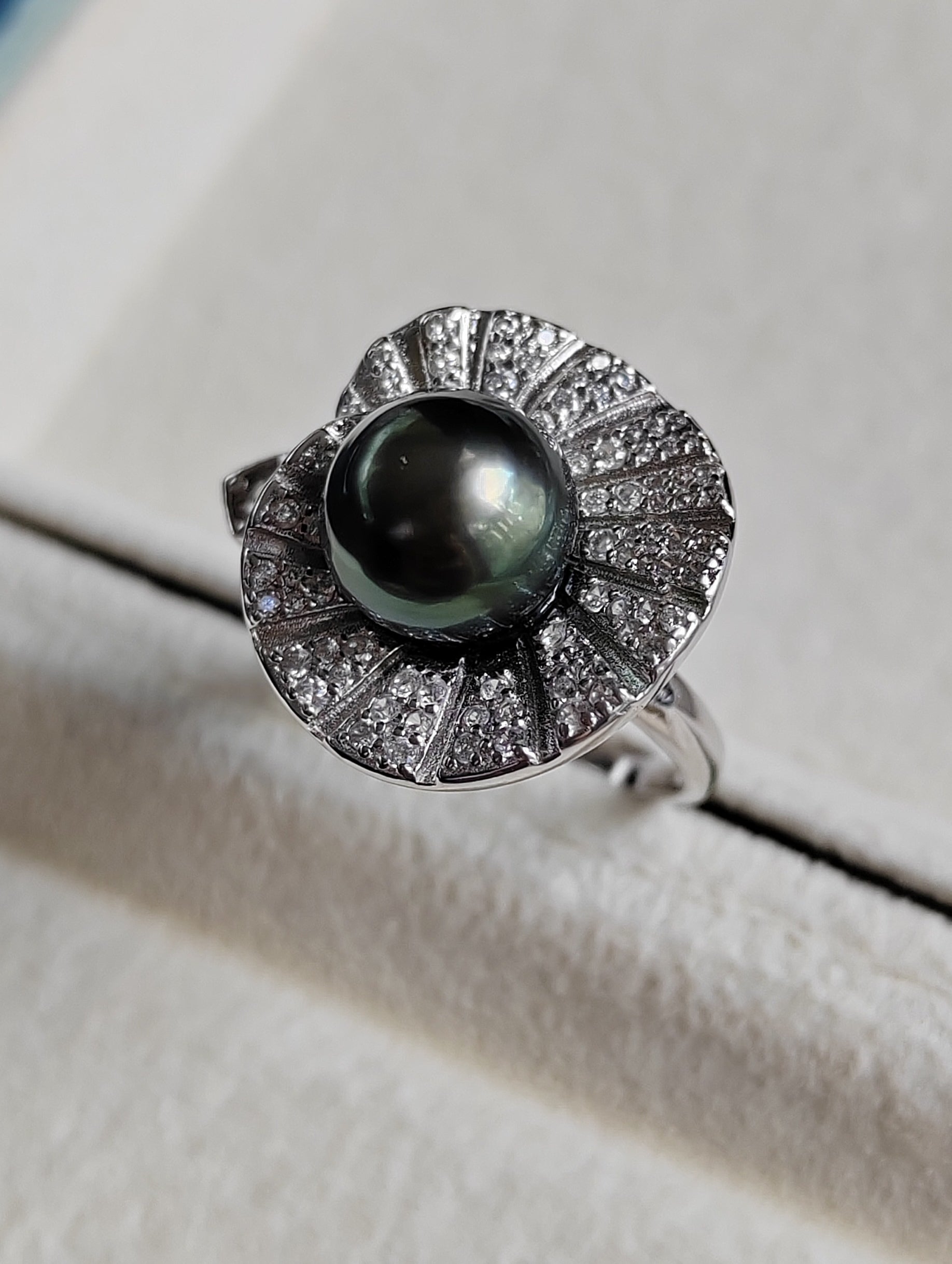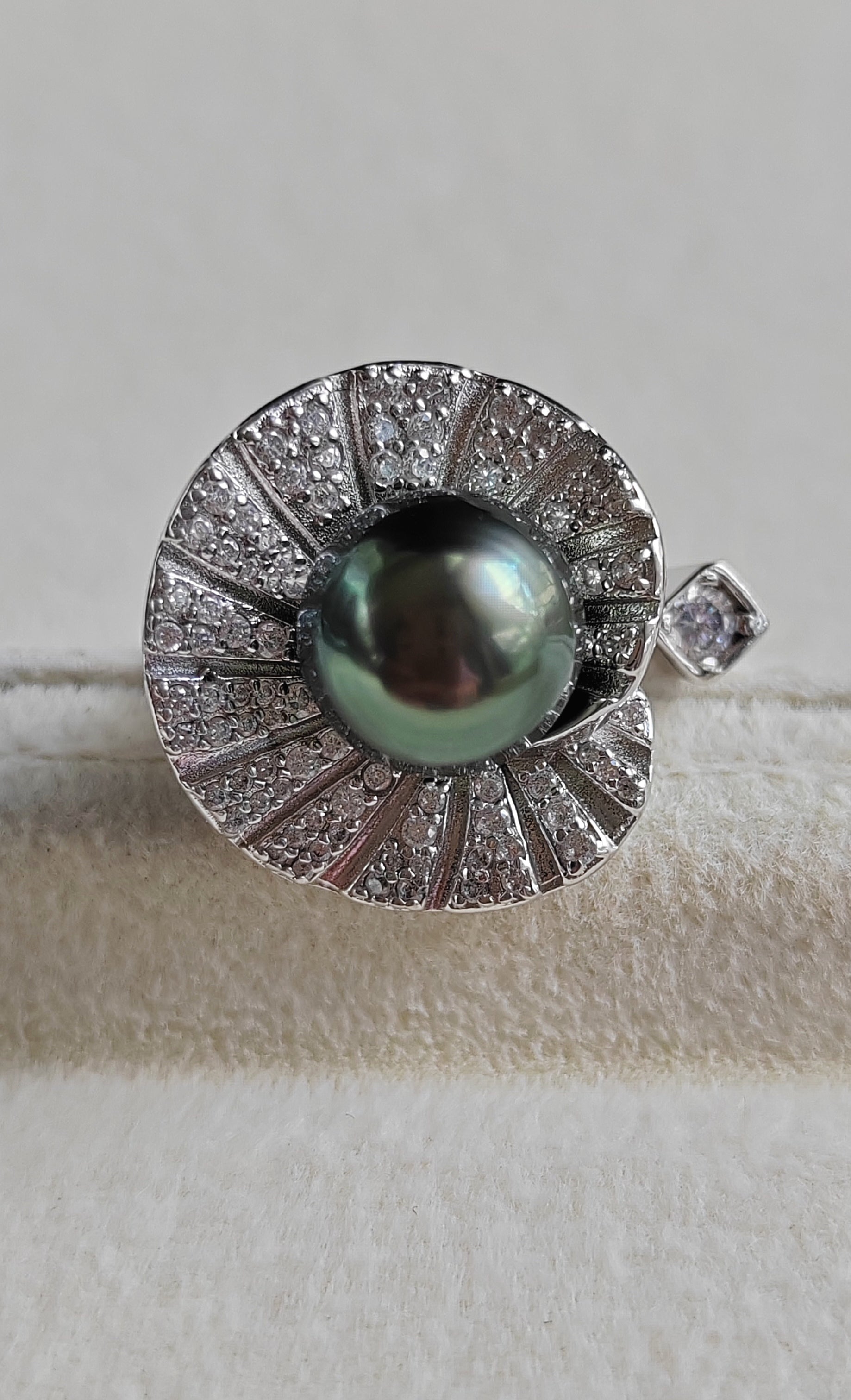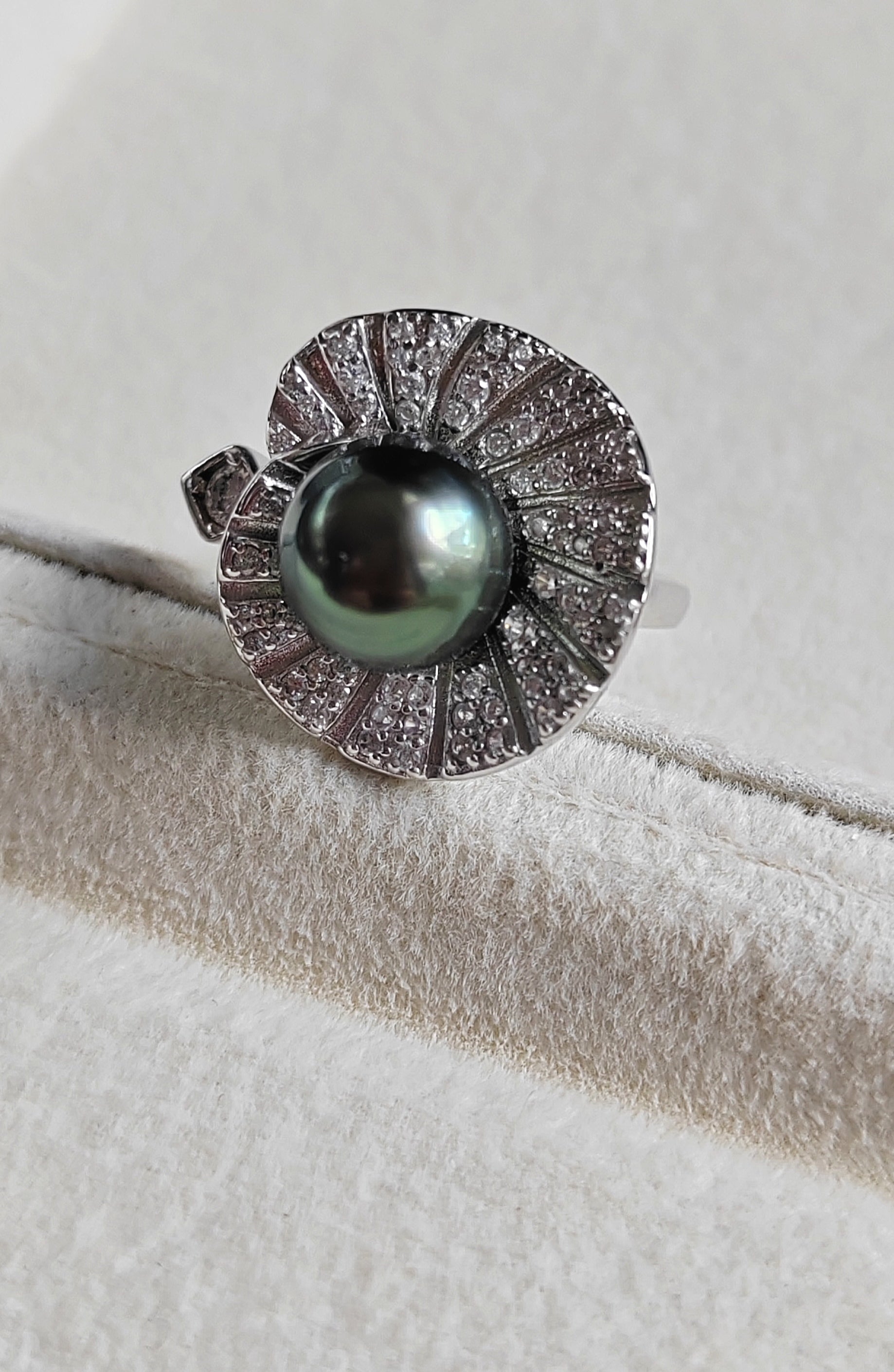 This gorgeous ring features a genuine tahitian south sea pearl semibaroque shape excellent luster, mounted on sterling silver base hallmarked surrounding with sparkling cz stones.