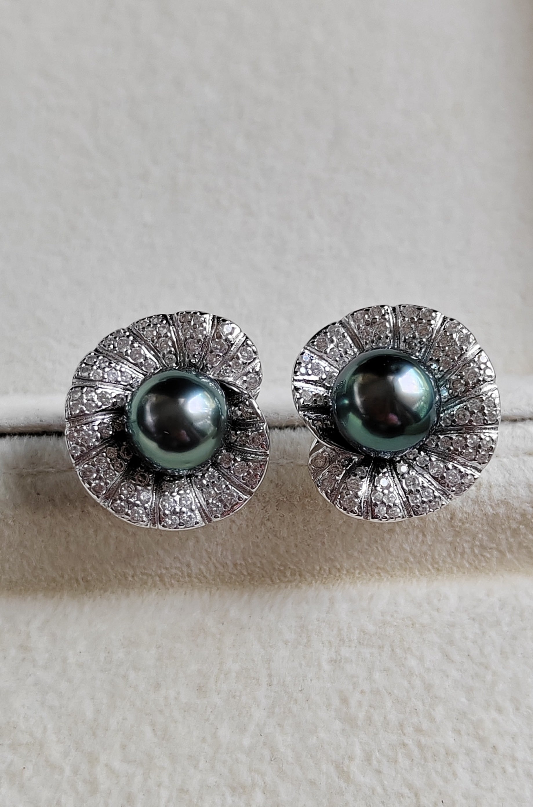 These stunning earrings feature two genuine tahitian south sea pearls semibaroque shape, superior luster, mounted on thick sterling silver base hallmarked surrounding with sparkling cz stones.