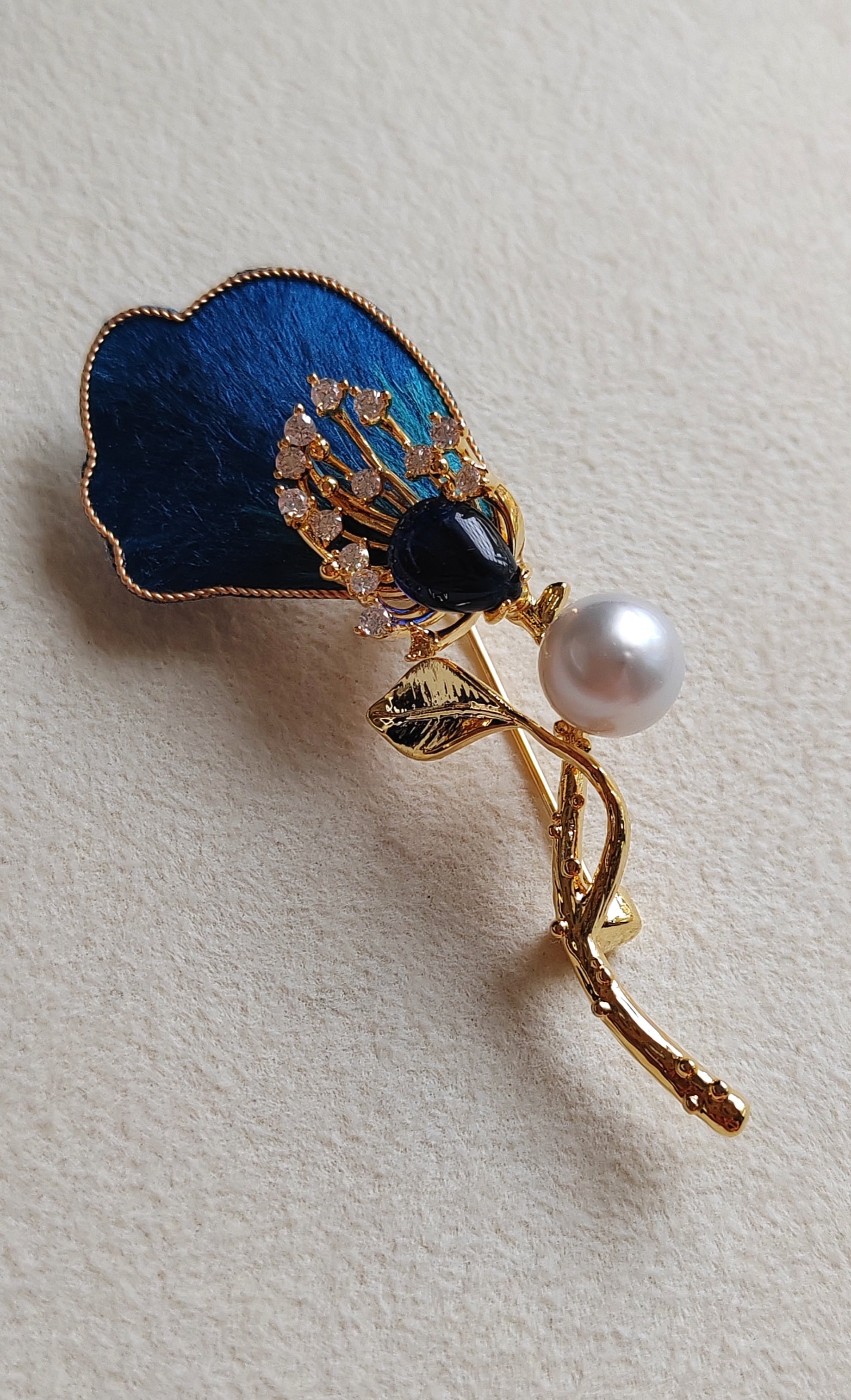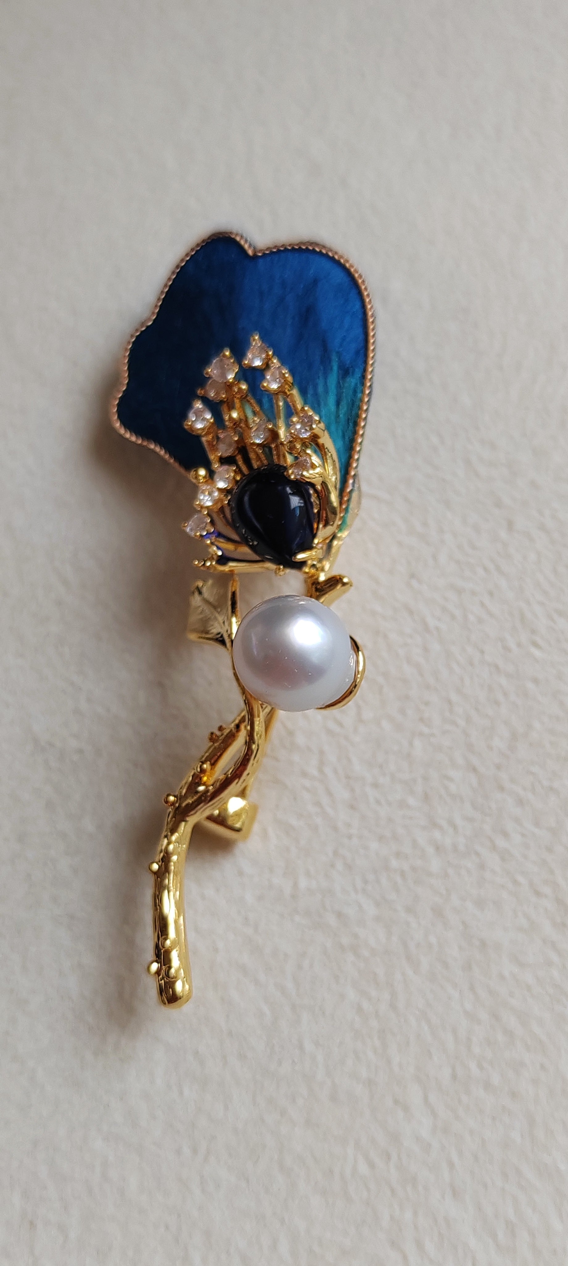 This gorgeous Lily brooch made of a genuine south sea white pearl semibaroque shape, very high luster, mounted on shiny gold coated flower.