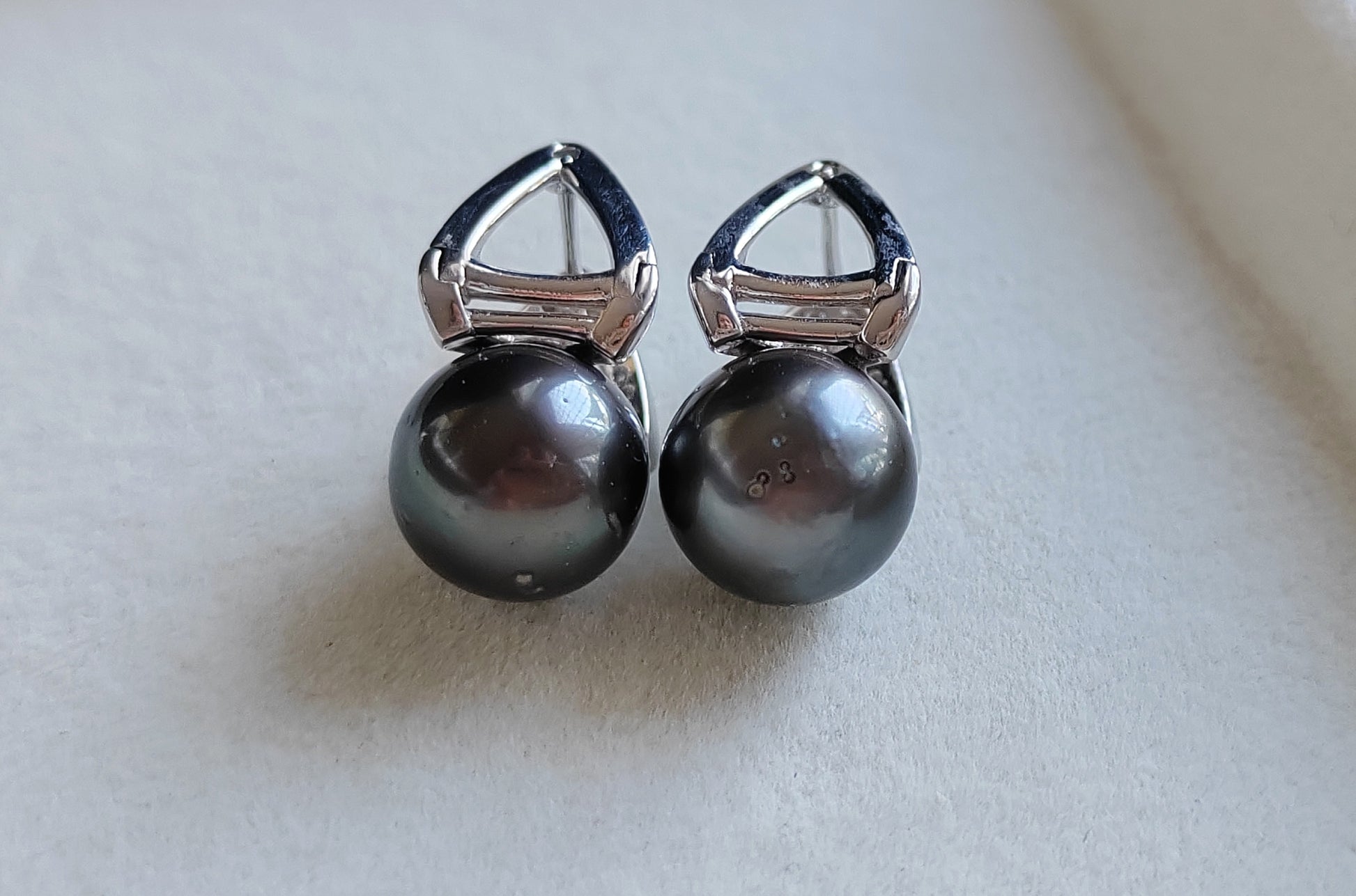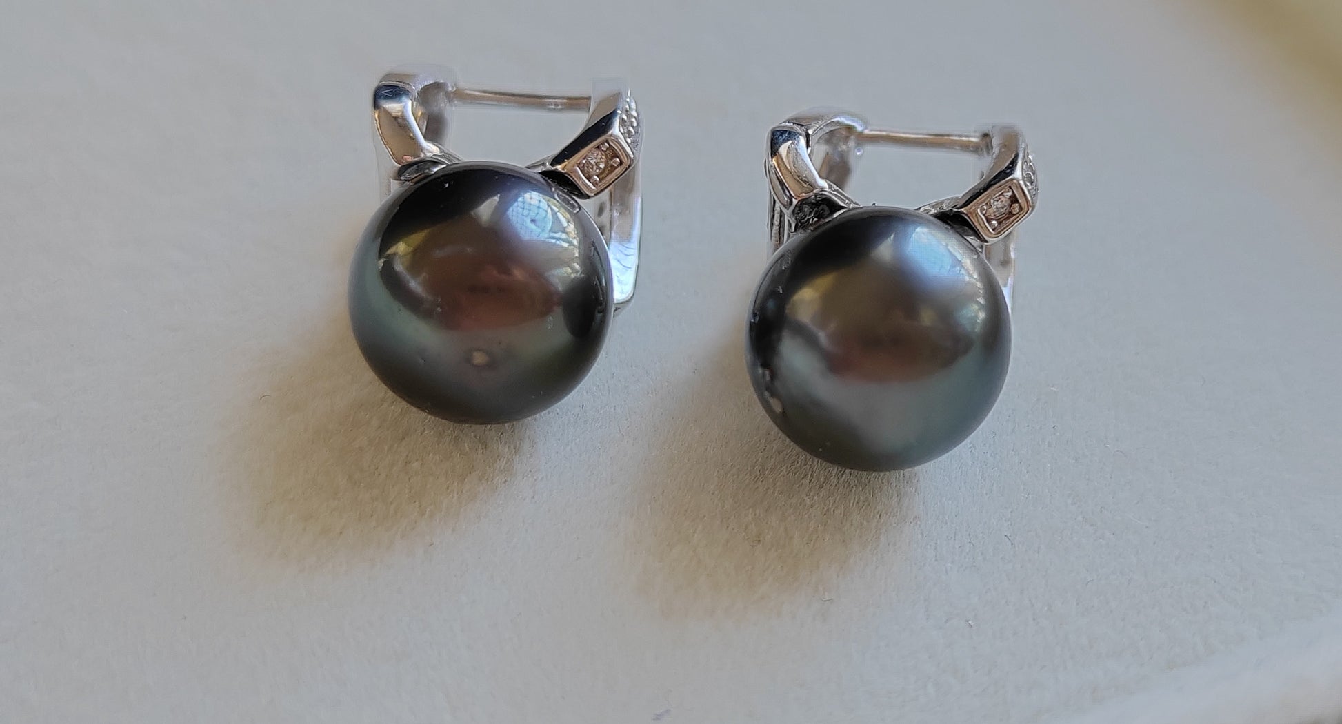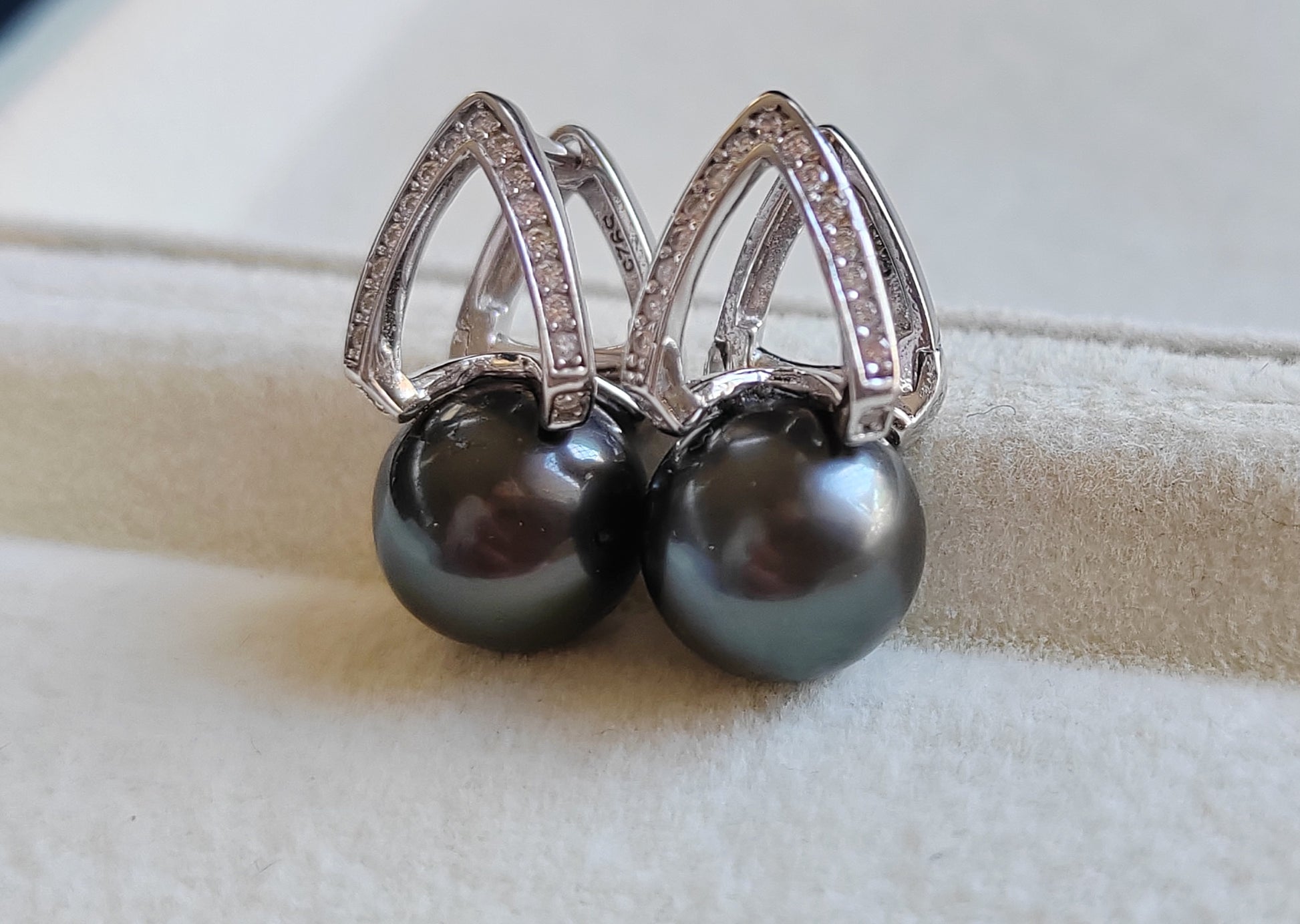 These gorgeous earrings made of two genuine tahitian south sea pearls round shape excellent luster, mounted on sterling silver base hallmarked with sparkling cz stones.