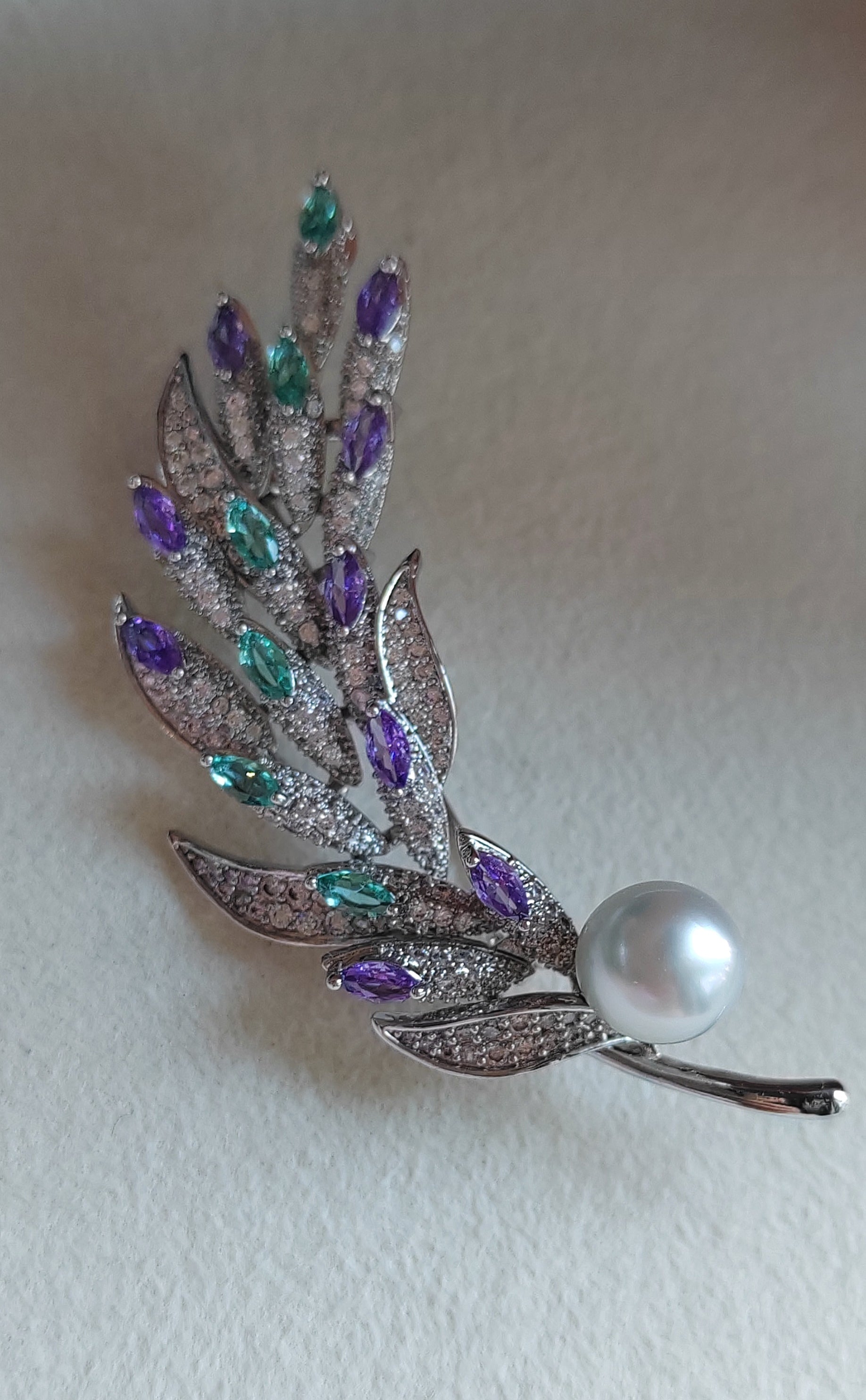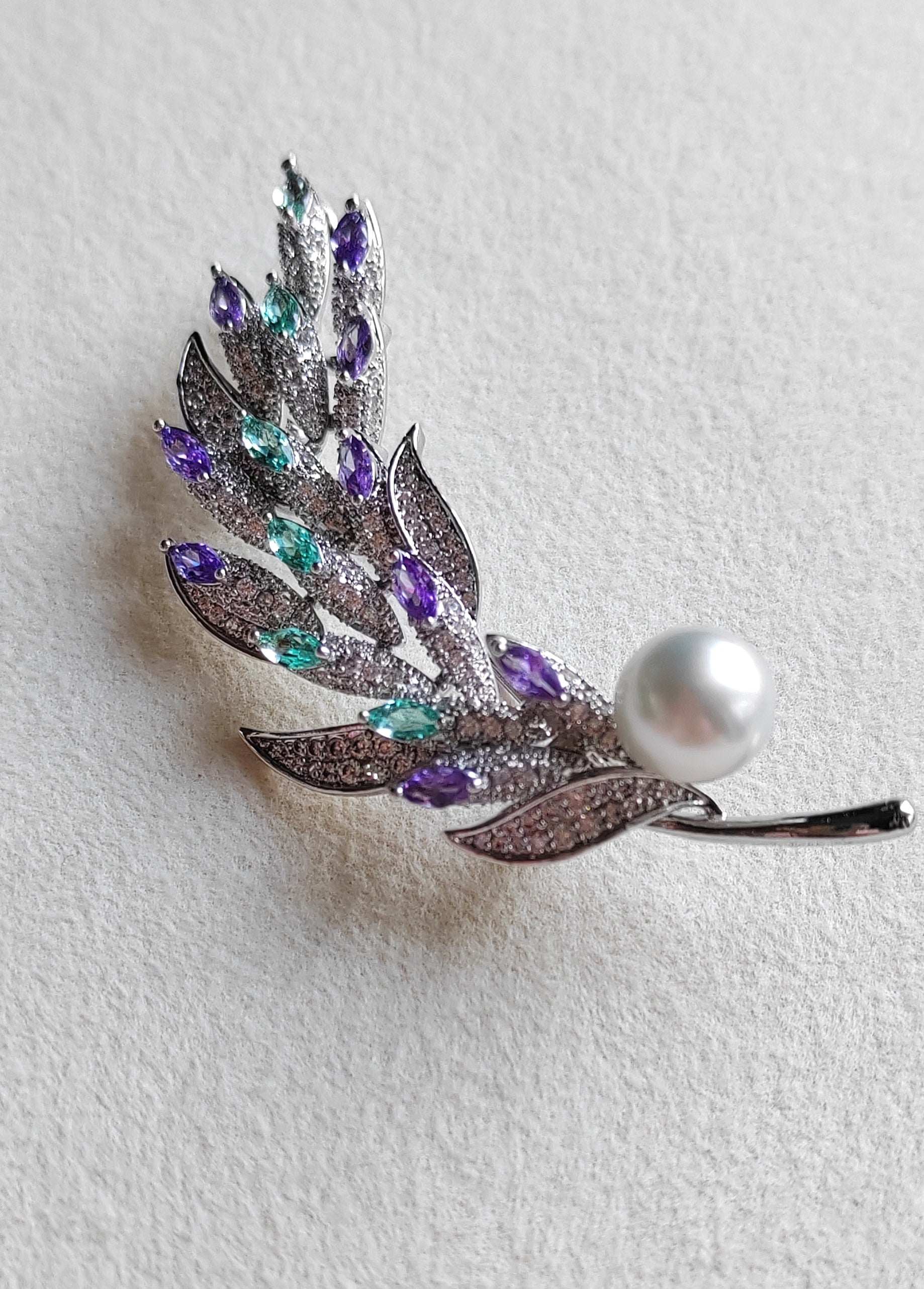 This gorgeous brooch features a genuine south sea white pearl baroque shape, in cold white tone, very high luster, set with high quality sparkling cz stones.